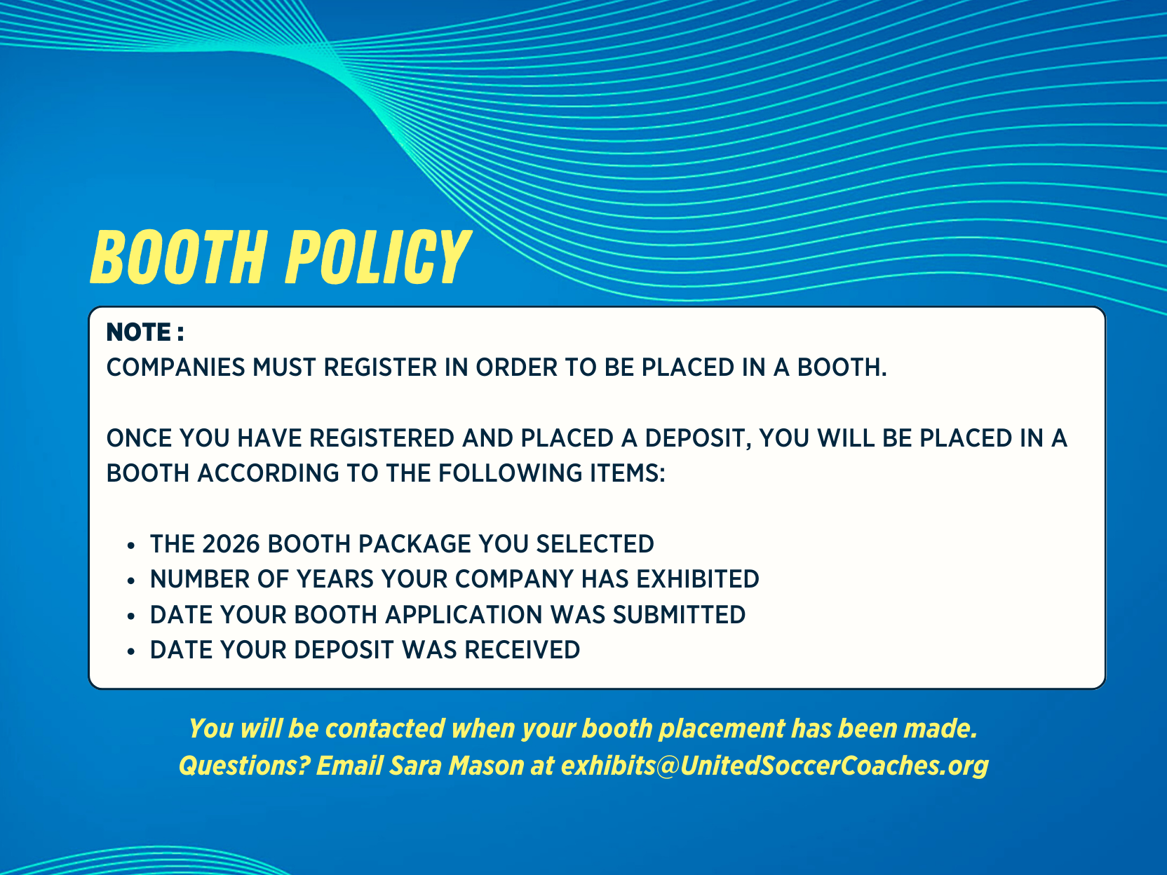 - Booths will be sold until the Exhibit Hall is sold out.