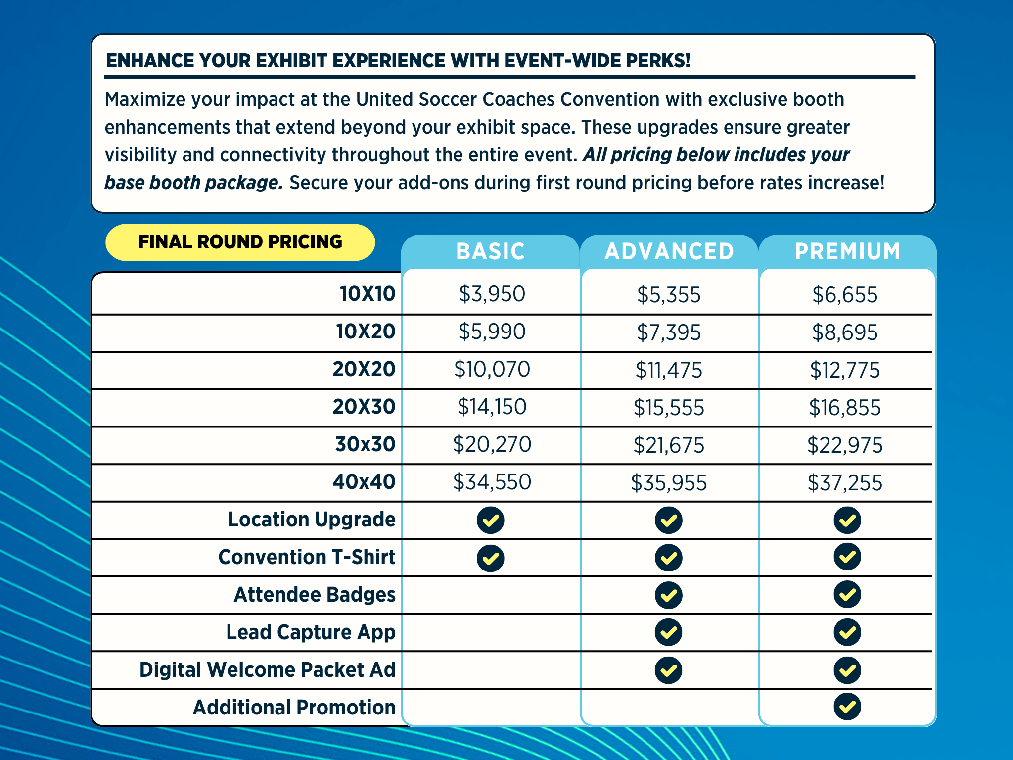 - Maximum of 24 badges allowed for booths 20x20 and larger